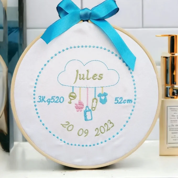 Offrez un cadeau original et personnalisé pour célébrer l'arrivée d'un bébé et embellir sa chambre. Nos cadres brodés sur tissu suédine sont parfaits pour une touche douce et raffinée.